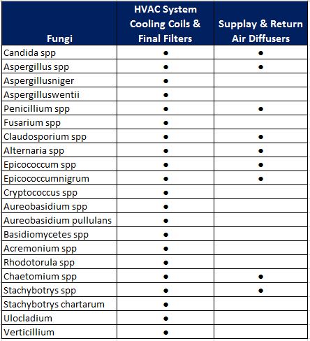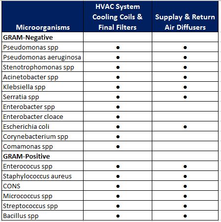 Numerous studies have demonstrated that the HVAC system is a viable reservoir of pathogenic and opportunistic bacteria and mold. Below is a partial list of microorganisms that have been found on evaporator coils, drain pans and ducts: