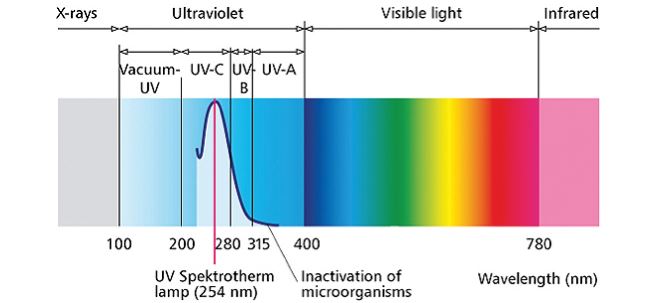 Ultraviolet (UV) light is one form of electromagnetic energy produced naturally by the sun. UV is a spectrum of light just below the visible light and it is split into four distinct spectral areas – Vacuum UV (100 to 200 nm), UVC (200 to 280 nm), UVB (280 to 315 nm) and UVA (315 to 400 nm).